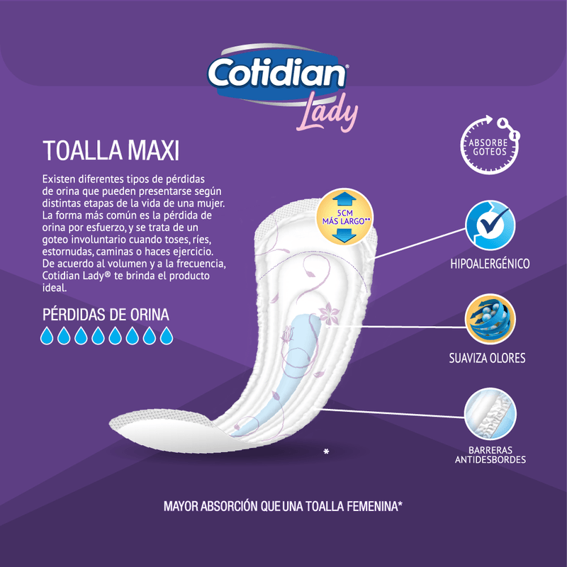 Toalla Femenina para pérdidas de orina leves. Con mayor absorción que un protector diario y control de olores. Los protectores diarios de Incontinencia Cotidian Lady absorben más que el promedio de la categoría de protectores diarios femeninos de menstruación, en base a metodología interna de la empresa. Podrás sentirte segura y protegida todo el día.